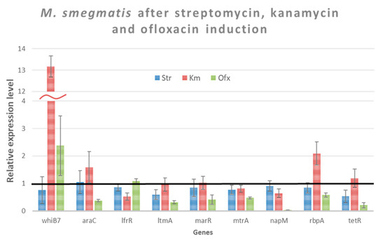 The relative level of the studied genes expression in cells of M. smegmatis cultivated in the presence of antibiotics. Expression of the studied genes in the absence of antibiotics was considered equal to 1 (black line—M. smegmatis control without induction). The error bars represent the standard deviation calculated from three independent replicates.