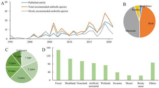 The yearly number of published articles with umbrella species as study species indexed by Science Citation Index Expanded, as well as the yearly number of total and newly (excluding umbrella species that had been proposed before) recommended umbrella species since 1984 to 2021 (A), the proportions of 213 recommended umbrella species across different taxa (B), the proportions of recommended umbrella species that use varying types of habitat (C), and the number of species for each type of habitat (D).