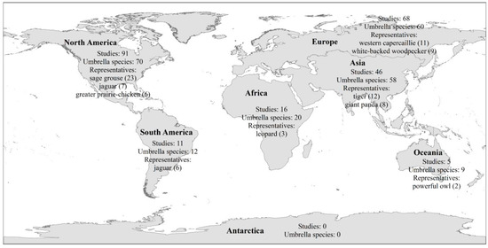 Distribution of study efforts and recommended umbrella species across continents, and the most studied representatives for each continent, with the number of articles on each representative in parentheses.