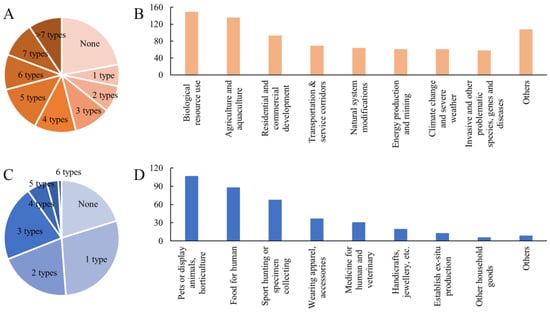 The threat statuses of 213 recommended umbrella species: (A) the proportions of recommended umbrella species that are impacted by varying types of threats and (B) the number of species that are impacted by each type of threat; (C) the proportions of recommended umbrella species that are harvested by humans (whole individuals, parts, or products from individuals) for varying types of end uses, and (D) the number of species that are used for each type of end use.