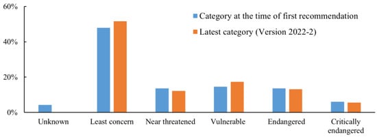 Proportions of the 213 recommended umbrella species across different threatened categories assessed at the year closest to the first recommendation of each umbrella species (blue bars), and assessed in the latest version of the IUCN Red List of threatened species (2022-2; orange bars). Any categories assigned as unknown, not recognized, and data deficient were grouped as unknown.