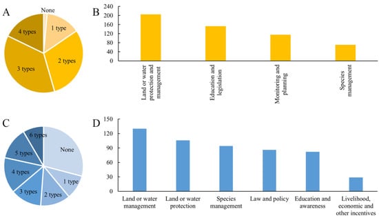 Conservation statuses of the 213 recommended umbrella species: (A) the proportions of recommended umbrella species that are currently protected by varying types of conservation actions, and (B) the number of species that are under protection for each type of conservation action; (C) the proportions of recommended umbrella species that need varying types of conservation actions, and (D) the number of species that need each type of conservation action.