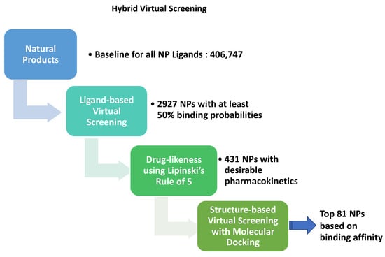 The unprecedented advancements in computational resources over the last three decades have greatly improved the efficiency of finding new drugs. With modern parallel computing, millions of compounds can be virtually screened against viral proteins in a relatively short time and ranked according to the calculated binding affinity [10]. Thus, markedly decreasing the number of potential lead molecules that need to be experimentally tested for validating their binding efficacy against the viral target protein. There are two general approaches to virtual drug screening. Ligand-based virtual screening (LBVS) is a widely used high-throughput in silico drug screening approach that makes use of the known properties of the compounds (ligands) to evaluate their suitability to bind to a receptor (such as viral protein) [11]. The two main advantages of an LBVS approach are its speed and the fact that it does not rely on the availability of the three-dimensional (3D) structure of the target, which is often a limiting factor. Thus, LBVS can be used as a first step to screen for the binding affinities of hundreds of thousands of compounds against the target and select potential candidates predicted to strongly bind to the target of interest. On the other hand, structure-based virtual screening (SBVS) depends on the 3D structure of the target molecule. The SBVS approach is computationally demanding but performs close inspection of the binding site topology of the target, such as the occurrence of cavities, clefts, sub-pockets, and electrostatic properties, to find the compounds that would most effectively bind to the target [12]. Therefore, SBVS results provide substantial validation of the compounds identified by the LBVS approach to bind the target of interest. Thus, when applied sequentially, referred to as a hybrid approach, these two approaches complement each other by reducing the time and cost of the resources needed to screen many compounds.