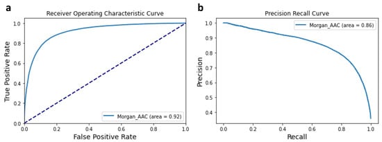 (a) ROC curve (Morgan + AAC) based on the test BindingDB datasets (b) Precision-Recall curve (Morgan + AAC) on test datasets.