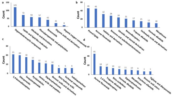 The top chemical categories represented within the 431 NP ligands identified as having potential to bind SARS-CoV-2 Mpro protein. (a) Chemical superclass, (b) Chemical class, (c) Chemical subclass, (d) Direct parent classification.