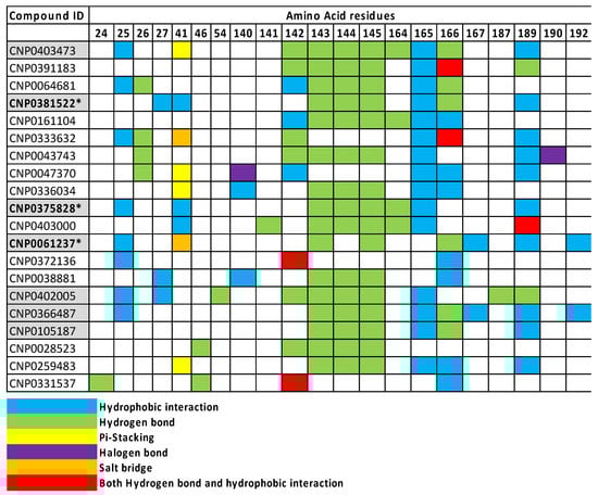 The interactions of the top 20 NP ligands with 6LU7 Mpro amino acid residues. The specific types of interactions between the ligands and the 21 amino acid residues of the Mpro are designated by different colors. The NP COCONUT ids are presented on the y-axis and amino acid residues of Mpro on the x-axis. The gray color indicates the seven in vitro tested compounds. COCONUT Ids in bold, gray color and with asterisk show in vitro inhibition with IC50 less than 4.52 × 10−4 M.