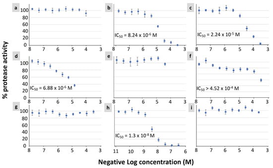 The results of in vitro protease inhibition assay of the seven NP ligands against the SARS-CoV-2 Mpro protein. The y-axis shows the percent Mpro protease activity. The x-axis shows the negative log10 transformed molar concentration of the NP ligands. A 10-dose three-fold serial dilution has been applied to the original 200 uM NP ligand. Some data points exhibited fluorescent backgrounds and were excluded from curve fitting. (a) CNP0403473, (b) CNP0381522, (c) CNP0375828, (d) CNP0061237, (e) CNP0402005, (f) CNP0366487, (g) CNP0105187, (h) GC376 (positive control), (i) DMSO (negative control). The IC50 values are provided for the four NPs and the positive control (subfigures b–d,f,h).