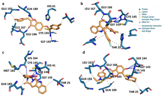 Schematics of the 2D interactions between the four in vitro validated ligands and 6LU7 Mpro structure.