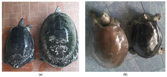 The Southern River terrapin (Batagur affinis) [] (also known locally as Tuntung Sungai) is a freshwater turtle found in large rivers all over the Indochina region. B. affinis (Figure 1) is exclusively distributed in Indochina, including Sumatra, Singapore, Peninsular Malaysia, Thailand, Vietnam, and Cambodia [,]. This species is listed by the Turtle Conservation Coalition [] as one of the world’s 25 most endangered freshwater turtle species. In addition, it is classified as “critically endangered” (CR) on the International Union for Conservation of Nature’s (IUCN) Red List [] due to several threats, including sand mining, egg consumption, and water sedimentation [].