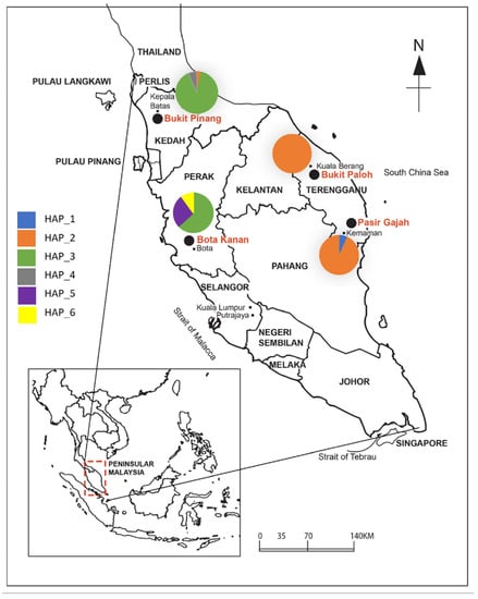 Distribution of haplotypes in sampling locations (see Results section). Samples collected from four study sites in Peninsular Malaysia (Bukit Pinang (BP), Kedah; Bota Kanan (BK), Perak; Bukit Paloh, Kuala Berang (KB), Terengganu; Pasir Gajah, Kemaman (KE), Terengganu).