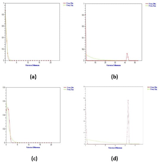 All the statistically non-significant tests were consistently compatible with the population’s being in drift-mutation equilibrium, as determined by Tajima’s D and Fu’s FS test statistics. Nonetheless, Fu’s simulations denoted that Fu’s FS was a more sensitive indicator of population expansion than Tajima’s D [].
