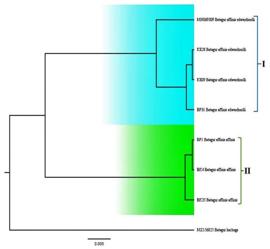 To construct the phylogenetic trees, the mitochondrial sequences of Batagur affinis edwardmolli (MN069309) and Batagur kachuga (MZ156025) were selected from the GenBank online database as out-groups [,]. A Median Joining (MJ) network analysis was performed using NETWORK 10.2 (Fluxus Technology Ltd., Bandelt, Germany) [].