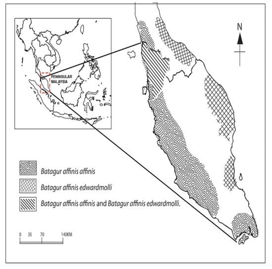 Batagur affinis is one of 24 turtle species found in Malaysia []. Currently, Malaysia is the only place on the planet where B. affinis affinis is still found in its natural habitat []. Wild B. affinis populations in Peninsular Malaysia have been documented based on minor morphological differences and coloration with collections of three nuclear DNA markers and three mitochondrial markers that are used to differentiate between two subspecies of B. affinis populations in Peninsular Malaysia []. The Western coast populations are placed mainly in B. a. affinis, while the Eastern coast populations are assigned to B. a. edwardmollis []. The nominate subspecies, B. affinis affinis, is now only found on the western coast of Peninsular Malaysia, as it is believed to be extinct in the wild in Thailand [] and Sumatra, Indonesia [].