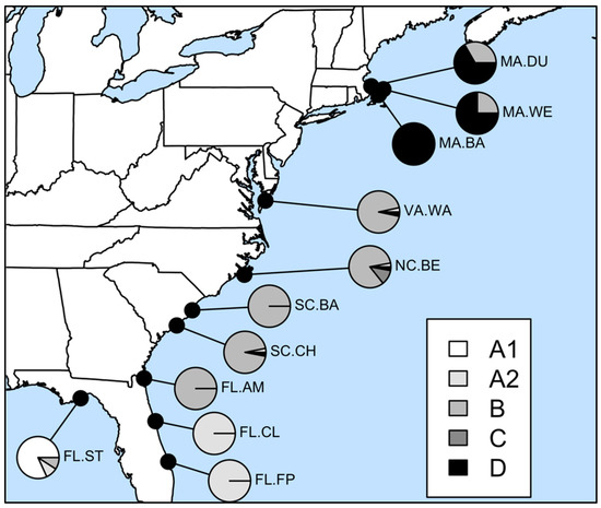 The populations were not reciprocally monophyletic. Each population was dominated by one or two COI clades, but most populations harbored 1–2 other clades at low frequency. As examples, the Gulf of Mexico population has a low frequency of the mid-Atlantic B clade, while a North Carolina population has a low frequency of the Gulf of Mexico A1 clade and Massachusetts D clade. These may reflect low-frequency dispersal events between the regions, incomplete lineage sorting, or a mix of both.