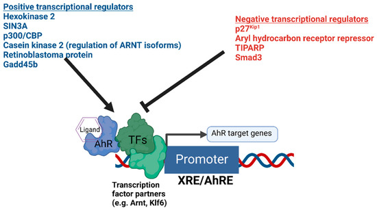 Summary of the positive and negative transcriptional co-regulators of AhR signaling. The diagram depicts AhR bound to DNA in complex with potential heterodimer partner proteins and regulators. Different positive and negative regulators of AhR-mediated transcription are summarized above.