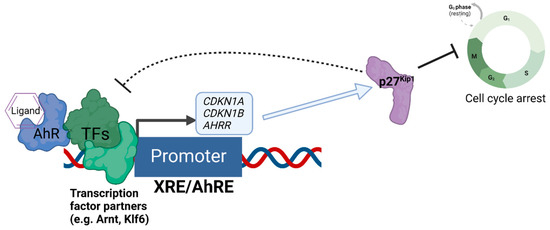 Negative regulation of AhR-mediated transcription by the expression of p27Kip1. The diagram depicts the regulatory relationship between p27Kip1 and AhR, whereby AhR acts as a direct transcriptional regulator of the transcription of p27Kip1, and increased expression of p27Kip1 both inhibits cell cycle progression and represses the AhR-mediated transcription of genes such as CDKN1A (encoding p21Cip1), AHRR, and CDKN1B (encoding p27Kip1 itself) as an auto-feedback loop.