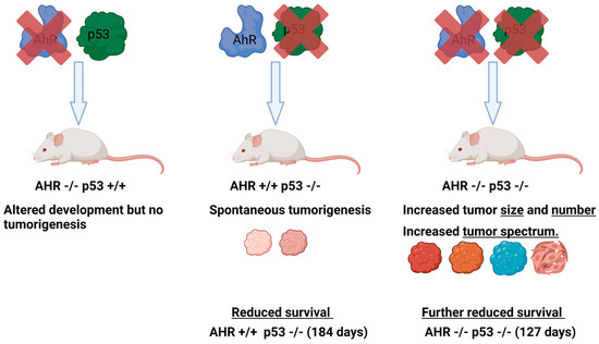 To further define the role of AhR in cancer, we recently investigated the impact of the loss of AhR on tumorigenesis in p53-deficient mice [155]. TP53, encoding the tumor suppressor p53, is a transcription factor and critical regulator of the cell cycle, cell fate, cell death, and differentiation [156]. We reasoned that while the loss of AhR alone is insufficient to result in tumorigenesis, the ability of AhR to suppress carcinogenesis would become apparent in the background of disabled tumor suppressor signaling and the resulting oncogenic pressure downstream of the loss of p53.