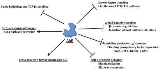 In different cancer types and genetic models, AhR has been shown to negatively regulate signaling pathways and factors which promote tumorigenesis (Figure 3). Examples include Wnt/β-catenin signaling [83,84], TGFβ and SHH signaling [85,86], pluripotency factors [87,88,89], epigenetic regulators such as BET proteins [90], and estrogen receptor α (ERα) [91,92]. AhR can also regulate the progression of the cell cycle through interactions with checkpoint regulators such as Rb [72,93] and activating the expression of cell cycle inhibitors such as cyclin G2 [77] and the cyclin-dependent kinase inhibitors p27Kip1 [69,78,94] and p21Cip1 [79].