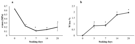 Plot of (a) mechanical strength and (b) weight loss% during soaking in Tris-HCl. Average values ± SD, n = 6. * p < 0.05 compared to 0 days.