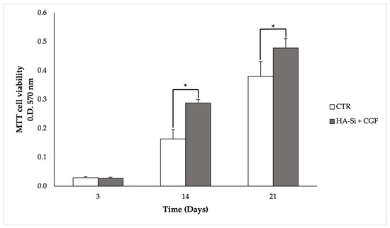 Proliferation and viability analysis of CGF primary cells cultured on HA-Si scaffold by MTT assay after 3, 14, and 21 days from seeding. CGF primary cells released directly on the plate were used as a control. Data are represented as mean ± SD of triplicate measurements from three independent experiments. * p < 0.05 compared to CTR, using Student’s t-test.