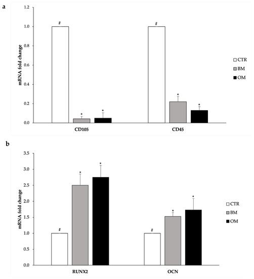 As regards the analysis of stem cell markers, the results reported in Figure 5a show that when compared to control cells, the expression of genes for CD105 and CD45 is significantly lower in cells grown on the HA-Si scaffold in terms of both the absence and presence of osteogenic differentiation inducers. In fact, the data obtained show that the abundance of mRNA for CD105 decreases by about 90% in cells cultured in either BM and OM; while the level of mRNA for CD45 records a 80% decrease in cells treated with BM and 87% in those treated with OM compared to control cells.