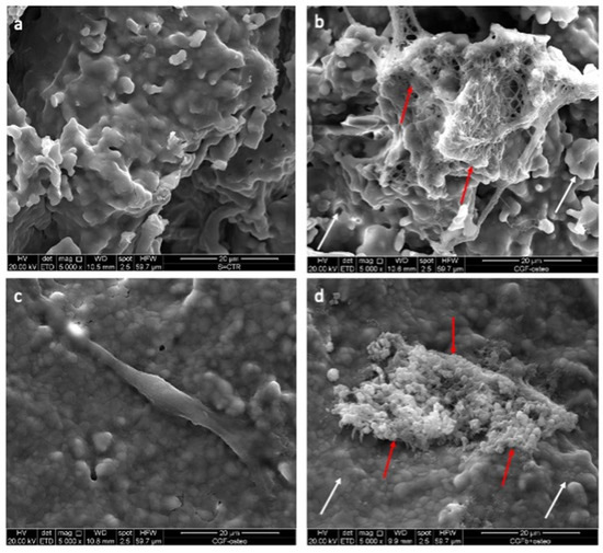 As shown in Figure 6c, the cells released by the CGF are able to adhere and colonize the interior of the HA-Si scaffold. Furthermore, in Figure 6b,c, it is possible to observe the formation of a cross-linked mineralized structure that is not present in Figure 6a, where it is represented on the HA-Si scaffold alone.