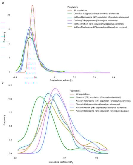 We determined the degree of relatedness between individuals in the captive crocodile population by employing a pairwise test. The mean pairwise r values were calculated for a total of 13,530 combinations of crocodiles, which included all 165 sampled individuals, including Siamese and saltwater crocodiles, were −0.018 ± 0.033 (CB population = −0.018 ± 0.042, NR population = −0.019 ± 0.029, CN population = −0.017 ± 0.030, NP population = −0.019 ± 0.032 for Siamese crocodiles and NR population of saltwater crocodiles = −0.020 ± 0.032). No pairs showed r < −0.25. There were 13,525 pairs with −0.25 < r < 0.25 and 5 pairs with 0.25 > r (Table 2, Tables S9–S13). Distribution of r values for the crocodiles exhibited a left skew, indicating lower pairwise r values than what would be expected under a null hypothesis of unrelated individuals by chance. The distributions of pairwise r differed significantly between the CB and NP populations, and the mean pairwise r values were also significantly different across all populations. (Figure 1, Table S14). The mean FIS was −0.074 ± 0.076 (Table 3), with individual values of FIS ranging from −0.191 to 0.085 (Tables S15–S19). However, distributions of FIS from all populations differed significantly from each other (Figure 1, Table S14). The Ne of Siamese crocodiles for individuals that contributed genetically to the CB population was 41.3 (95% CI: 32.2.8–46.5), 202.2 (95% CI: 87.7–113.3) for the NR population, 115.5 (95% CI: 69.5–88.1) for the CN population, 45.2 (95% CI: 37.1–136.1) for the NP population, and 103.7 (95% CI: 66.7–74.8) for saltwater crocodiles in the NR population (Table 4).