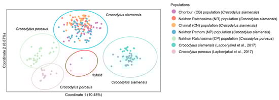 Principal component analysis of Siamese (Crocodylus siamensis, Schneider, 1801) [1] and saltwater crocodiles (C. porosus, Schneider, 1801) [13]. Table S1 provides detailed information on the sampled individuals and Lapbenjakul et al. [11].