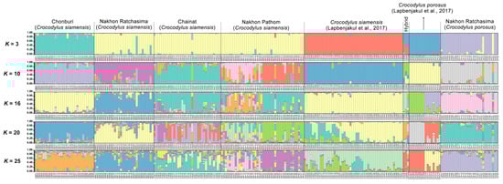 Population structure of 136 Siamese (Crocodylus siamensis, Schneider, 1801) [1] individuals and 29 saltwater crocodile (C. porosus, Schneider, 1801) [13] individuals. Each vertical bar on the x-axis represents an individual, while the y-axis represents the proportion of membership (posterior probability) in each genetic cluster. Crocodiles are superimposed on the plot, with black vertical lines indicating the boundaries. Detailed information for all crocodile individuals is presented in Table S1 and Lapbenjakul et al. [11].