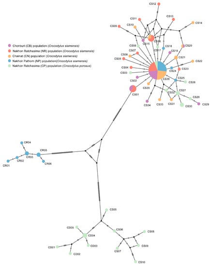 Haplotype network based on sequence data for the mitochondrial DNA D-loop region of Siamese (Crocodylus siamensis, Schneider, 1801) [1] and saltwater crocodiles (Crocodylus porosus, Schneider, 1801) [13].
