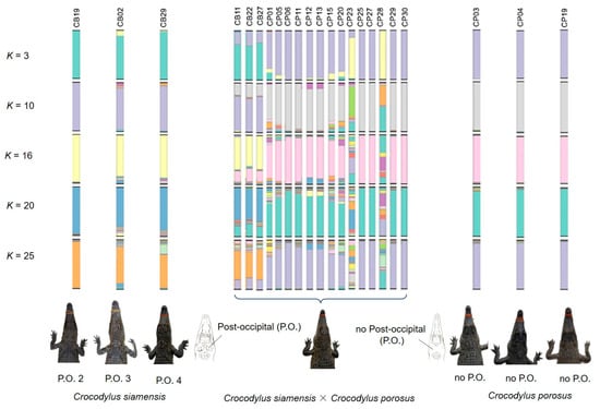Representation of structure plot and post-occipital scutes (P.O.) for hybrids between Siamese and saltwater crocodiles (Crocodylus siamensis × Crocodylus porosus) and pure Siamese and saltwater crocodiles. Detailed information for all hybrids between Siamese and saltwater crocodile individuals is presented in Figure 3 and Figure S3.