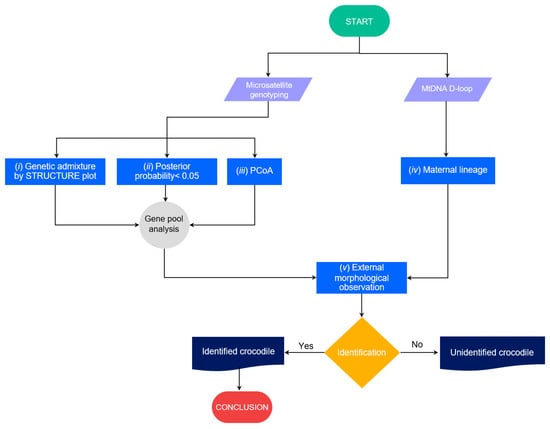 Schematic representation of criteria to screen hybrid crocodiles between Siamese and saltwater crocodiles to prove the hybridization level status in each Siamese crocodile individual before they can be used in the reintroduction program.