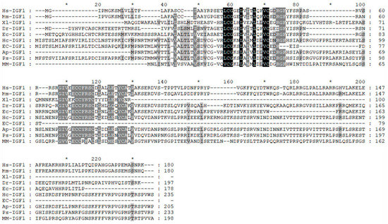 - Li, X.; Feng, S.; Wang, H.; Shen, X.; Chen, Y.; Xuan, X.; Fu, Y.; Bai, Z.; Li, W. Identification and Functional Analysis of the Cell Proliferation Regulator, Insulin-like Growth Factor 1 (IGF1) in Freshwater Pearl Mussel (Hyriopsis cumingii). Biology 2022, 11, 1369. [Google Scholar] [CrossRef] [PubMed]