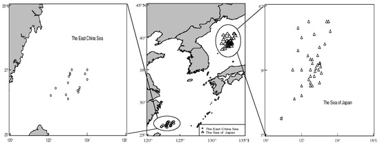 Figure 1. Distribution of sampling stations. (The circles represent sampling stations of T. pacificus in the East China Sea, the triangles represent sampling stations of T. pacificus in the Sea of Japan.)