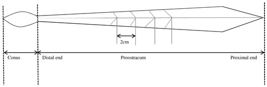 The gladius of T. pacificus consists of 3 morphological parts: rostrum, conus, and proostracum. The gladius was extracted from the back of the mantle cavity and cleaned in an ultrasonic cleaner for 10 min to remove residual soft tissue. Based on the growth direction of the proostracum, from the distal end to the proximal end, the proostracum was consecutively cut every 2 cm with acetone-washed fine scissors following the ‘V’ shape of the growth lines (Figure 2). A total of 63 segments was cut from T. pacificus of the East China Sea, and a total of 155 segments was cut from T. pacificus of the Sea of Japan. All segments were rinsed again with distilled water, freeze-dried at −55 °C for ≥24 h, and homogenized into a fine powder using a Mixer mill MM440 (Retsch, Haan, Germany) prior to SIA [25,26].