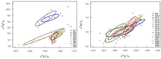 Stable isotope values in biological tissues can provide transitional information about matter and energy in food webs [21]. The value of δ13C (13C/12C) changes little with increasing trophic level, so δ13C can reflect the habitat of organisms and is mainly used to analyze the migration path of organisms. The value of δ15N (15N/14N) gradually increases with increasing trophic level, so δ15N can reflect the trophic level of organisms in an ecosystem, and δ15N can be used to analyze the feeding ecology of organisms [42].