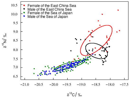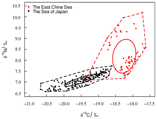 There was no significant difference in the average δ13C (samples in the East China Sea, 13C: F = 0.003, n = 9, p = 0.977 > 0.05; samples in the Sea of Japan, 13C: F = 0.150, n = 10, p = 0.483 > 0.05) and δ15N (samples in the East China Sea, 15N: F = 2.640, n = 9, p = 0.063 > 0.0; samples in the Sea of Japan, 15N: F = 0.008, n = 10, p = 0.446 > 0.05) values in both the East China Sea and the Sea of Japan (Figure 8).