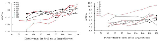 The gladius is the hard tissue of cephalopods. Cephalopods can convert nutrients from food into chitin and protein, and then the chitin and protein form the new structure of the gladius. The growth of the gladius is irreversible and continues through the whole life history [21], so the gladius is a good carrier for recording life history information [14]. In this study, the δ13C and δ15N values of gladii were used to analyze the migration path and feeding ecology of T. pacificus. For the T. pacificus collected in the East China Sea, the δ13C and δ15N values of most samples increased with the growth of the proostracum. For the T. pacificus collected in the Sea of Japan, the δ13C and δ15N values of most samples decreased with the growth of the proostracum.