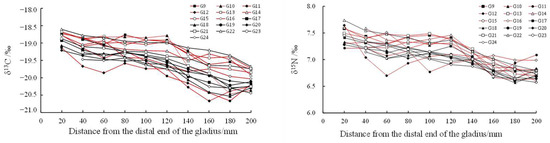 With the growth of the proostracum, the stable isotope values showed a fluctuating trend. The stable isotope values of T. pacificus collected in the East China Sea increased gradually, but the stable isotope values of T. pacificus collected in the Sea of Japan decreased gradually. When the proostracum grew to 120 mm from the distal end, the δ13C and δ15N values of T. pacificus in the two areas began to change greatly (Figure 6 and Figure 7).