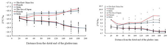 Figure 8. Relationship between average δ13C‰ and δ15N‰ values and the growth of the proostracum of T. pacificus collected in the East China Sea and the Sea of Japan. (Black line represents males, and red line represents females.)