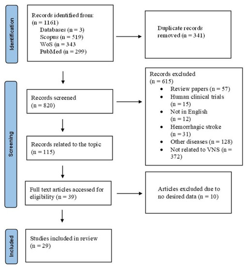 In this systematic review, we provided insights into the use of VNS as a therapeutic tool for the treatment of ischemic stroke. Duplicates were removed from the 1161 identified records, and records that were not published in English, were incomplete, or constituted a review were screened out. A total of 39 full-text articles were evaluated, with 29 relevant articles selected for review (Figure 1).