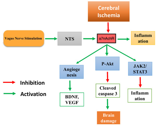 - Lu, X.X.; Hong, Z.Q.; Tan, Z.; Sui, M.H.; Zhuang, Z.Q.; Liu, H.H.; Zheng, X.Y.; Yan, T.B.; Geng, D.F.; Jin, D.M. Nicotinic Acetylcholine Receptor Alpha7 Subunit Mediates Vagus Nerve Stimulation-Induced Neuroprotection in Acute Permanent Cerebral Ischemia by a7nAchR/JAK2 Pathway. Med. Sci. Monit. 2017, 23, 6072–6081. [Google Scholar] [CrossRef]