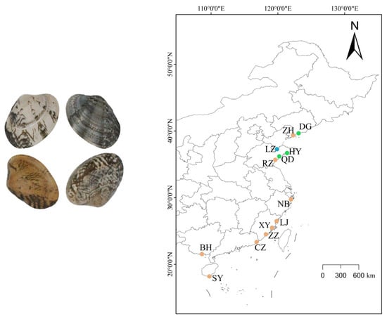 The Manila clam (Ruditapes philippinarum) is an important marine bivalve living in the intertidal zone and has the second largest production among bivalve mollusks []. In China, it is widely distributed in the coastal areas from Liaoning in the north to Hainan in the south []. It has become one of the most commercially important bivalves in the shellfish industry, with an annual production of more than three million tons []. In recent years, more than 60% of adult clams are produced in Liaoning and Shandong provinces []. In contrast, clam seeds for culture in northern China are mainly purchased from the artificial breeding in southern China. The mode of southern breeding and northern culture may have some negative impacts in local populations such as loss of genetic variation, inbreeding depression, and reduced effective population size [,]. Artificial breeding with a small number of parents may increase the probability of cross-generation inbreeding depression, possibly decreasing their ability to adapt to new and challenging environments. []. However, the current genetic structure in a wide range of clam populations remains largely unknown. Therefore, it is essential to investigate the genetic diversity and differentiation of clam populations along the coast of China.