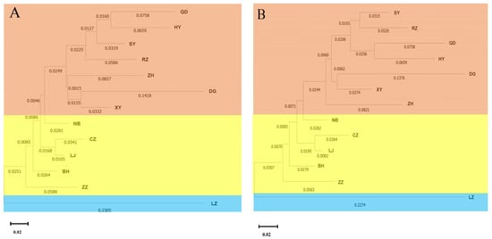 Cluster analysis of 13 populations of R. philippinarum by NJ (the neighbor-joining) and ME (the minimum evolution) methods. (A) NJ tree; (B) ME tree. The different colors are used to differentiate the clustered clades among the clam populations. The orange color represents the independent branch of the clam populations, including QD, HY, SY, RZ, ZH, DG, and XY. The orange clade clusters with the yellow branches (NB, CZ, LJ, BH, and ZZ), forming into a higher-level clade. The blue color represents the independent branch for the LZ population different from the large clade.