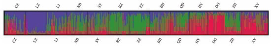 Eleven pairs of microsatellite markers with stable amplification were selected from the previous reports [,]. The basic information for primer sequences and PCR conditions is shown in Table 2. The fluorescent labeling for SSRs using M13 tails were performed according to the previous study with minor modifications []. Briefly, three primers were used for each PCR amplification: (1) the first one was a forward primer with M13 tails at the 5′ end; (2) the second one was an SSR reverse primer; (3) the third one was an M13 universal primer with a fluorescent label (the 5′ end labeled with 6-carboxy-fluorescine (Fam), hexachloro-6-carboxy-fluorescine (Hex), 6-carboxy-X-rhodamine (Rox), and tetramethylrhodamine (Tamra) fluorescent groups). The selected primer pairs were sorted according to the size ranges. The similar size fragments were labeled with different fluorescence, while different size fragments were labeled with the same fluorescence (Figure S1, Table 2). The PCR reaction system included template DNA 50 ng, 2× Taq plus Master Mix II 8 µL (Nanjing Vazyme Biotechnology Co., Ltd., Nanjing, China), forward primer 0.04 µL (10 µmol/L), reverse primer 0.16 µL (10 µmol/L), and fluorescent labeled M13 primer 0.16 µL (10 µmol/L), plus dd H2O to 16 µL. The PCR reactions were performed as follows: 94 °C for 5 min; 30 cycles of 94 °C for 30 s, 53 °C for 45 s, and 72 °C for 45 s; 8 cycles of 94 °C 30 s, 53 °C 45 s, 72 °C 45 s; a final extension at 72 °C for 10 min. The quality of PCR products was detected by 1.5% agarose gel electrophoresis. Finally, 1 µL of PCR products was added to 22 µL formamide and 0.5 µL ROX standard and run on the ABI 3730XL (Shanghai Sangon Bioengineering Co., Ltd., Shanghai, China).