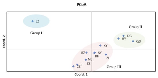The sampled location for the Manila clam (Ruditapes philippinarum) along the coast of China. The map of the People’s Republic of China is downloaded from the website of http://bzdt.ch.mnr.gov.cn/, accessed on 7 December 2021. The color dots representing the three groups revealed by the PCoA analysis: blue (LZ), green (DG, HY, QD), and orange (ZH, RZ, NB, LJ, XY, ZZ, CZ, BH, and SY).
