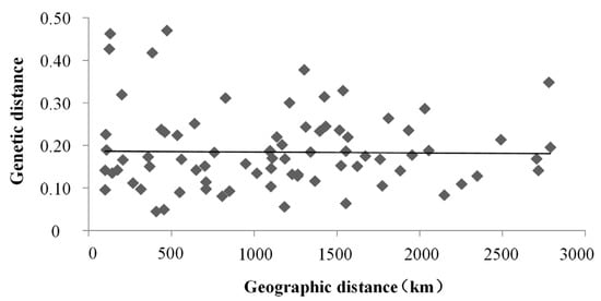 The non-significant linear regression between genetic distance and geographic distance based on eleven microsatellite loci in the clam samples (Y = −5.41 × 10−6X + 0.1959, R2 = 0.0018, 10,000 permutations).