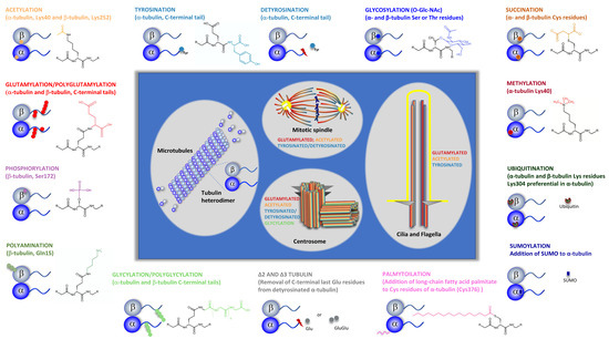 Tubulin post-translational modifications. Specific groups of functionally distinct MT structures and their more common PTMs are highlighted (i.e., centrosome, cilia, and mitotic spindle). Specific tubulins amino acid residues or tubulin specific domains where PTMs occur are indicated. PTMs chemical structure are specified. Tubulin PTMs caused by association with specific proteins, such as SUMO and ubiquitin, as well as those originated by specific proteolysis (detyrosination and Δ2 and Δ3 tubulin) are also shown. For Glutamylation PTM, only the chemical structure corresponding to monoglutamylation is shown.