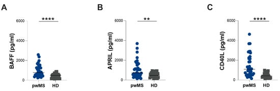Chicago/Turabian StyleZingaropoli, Maria Antonella, Patrizia Pasculli, Matteo Tartaglia, Federica Dominelli, Federica Ciccone, Ambra Taglietti, Valentina Perri, Leonardo Malimpensa, Gina Ferrazzano, Marco Iannetta, and et al. 2023. "Evaluation of BAFF, APRIL and CD40L in Ocrelizumab-Treated pwMS and Infectious Risk" Biology 12, no. 4: 587. https://doi.org/10.3390/biology12040587