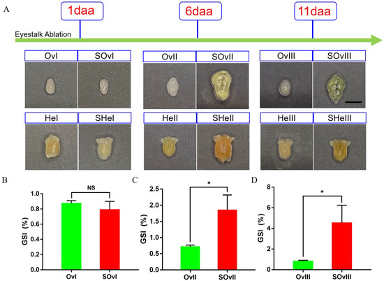 Development of the ovary and the hepatopancreas after unilateral eyestalk ablation in E. carinicauda. (A) Ovaries and hepatopancreases at different timepoints (scale, 500 μm). (B) Gonadosomatic index (GSI) of E. carinicauda at 1 day, (C) 6 days, and (D) 11 days after eyestalk ablation (NS: no significance, * p < 0.05). The experimental groups of ovaries include SOvI, SOvII and SOvIII, which means the ovary sample at 1 day, 6 days and 11 days after eyestalk ablation, respectively. The corresponding control groups at the same timepoint were marked as OvI, OvII and OvIII. The experimental groups of the hepatopancreas include SHeI, SHeII and SHeIII, which means the hepatopancreas sample at 1 day, 6 days and 11 days after eyestalk ablation, respectively. The corresponding control groups at the same timepoint were marked as HeI, HeII and HeIII. daa: days after eyestalk ablation.